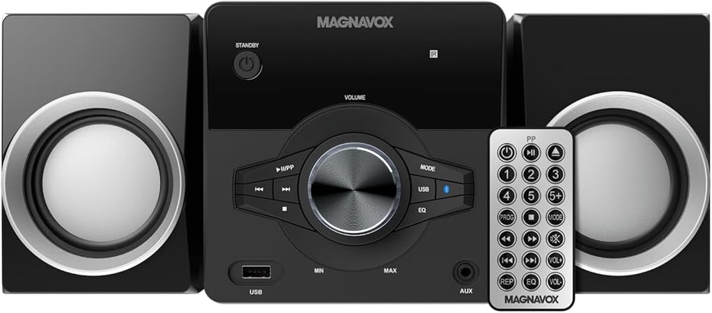 Top-loading CD/FM/Bluetooth system. AUX input, remote. Black/blue lights.